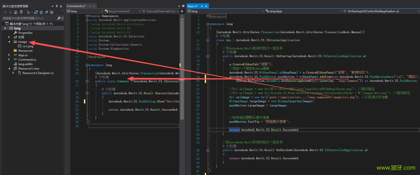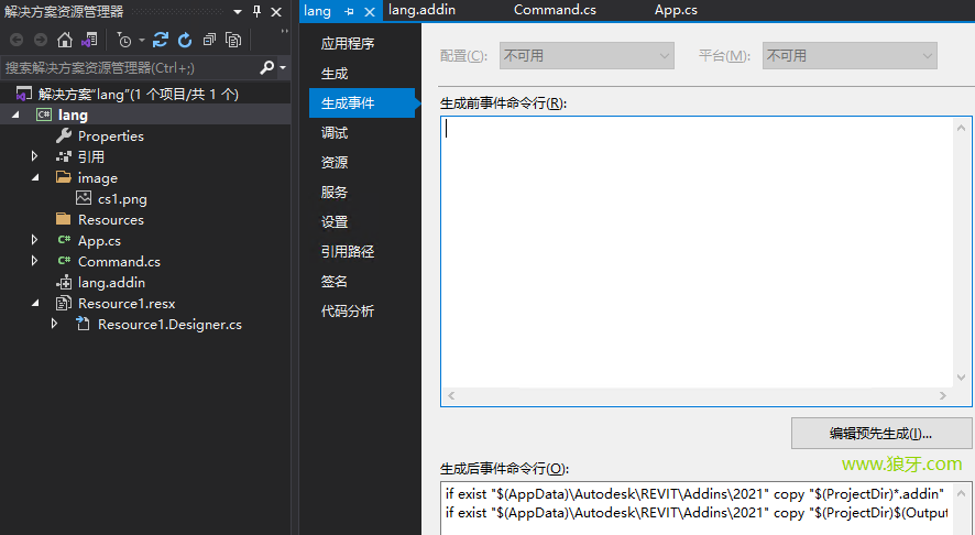 }代码中"lang.Command" lang对应命名空间,Command对应前面Command.cs文件中的类名,就是按钮点击后执行的命令。